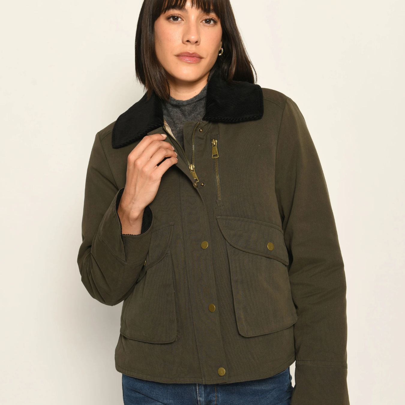 • Corduroy collar & flap pockets – Classic details with timeless charm